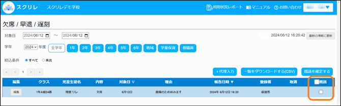 - 保護者からの連絡を確認したら、既読チェックボックスにチェックを入れます。