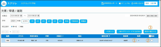 ①保護者が連絡 欠席/遅刻/早退を更新すると、[取消]欄にチェックマークが入ります。②更新された連絡を確認し、既読チェックボックスにチェックをします。